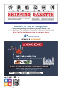Front: Pacific Star Express (Hong Kong) Co Ltd. Hong Kong Head Office Tel: 852-28809 555 Fax: 852-2563 0723 Website http://www.shippingazette.com Advertising Department Tel: 852-28809 555 Fax: 852-2563 0723 Recruitment Department Tel: 852-2579 5510 Fax: 852-2563 0723 E-mail: info@schednet.com Website http://job.shippingazette.com JUL 21, 2025 ( 星期一 ) Check out SG App WEEKLY SAILING ex HONG KONG to ISTANBUL CONTACT LUNWONG T: +852 2528 8776 lun.wong@pacificstar-hk.com STEPHEN SHUM T: +852 2528 8733 stephen.shum@pacificstar-hk.com WE OFFER SERVICES FROM HONG KONG TO FOLLOWING DESTINATIONS AMERICA EUROPE AUSTRALIA/NEW ZEALAND SOUTH AFRICA EGYPT MIDDLE EAST INDIA/PAKISTAN S. EAST ASIA N. EAST ASIA CHINA www.pacificstar-hk.com WE MAKE A DIFFERENCE! Istanbul isn’t just a stop - it’s a strategic partner. It offers a rich landscape of opportunities for handling goods from China. As the bridge between Asia and Europe, it is more than a destination, it’s a launchpad. And Pacific Star knows how to get you there.